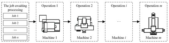 The GPFSP addressed in this paper is formally defined as follows. A production system handles non-preemptive independent jobs through sequential processing on distinct machines . Job contains operations in a fixed sequence, and each operation must be processed on a different machine. represents the operation of job on machine , requiring a known non-negative processing time . All jobs follow an identical machine, being sequentially routed from to (i.e., starting at machine , transitioning to , and terminating at ). The GPFSP optimization objectives involve identifying an optimal job permutation to achieve dual optimization of makespan minimization (total completion time) and machine energy reduction. Figure 1 illustrates the manufacturing workflow schematic.