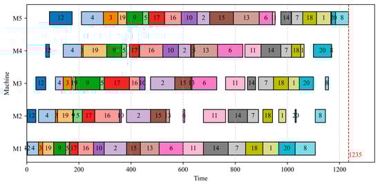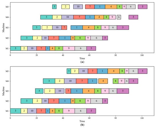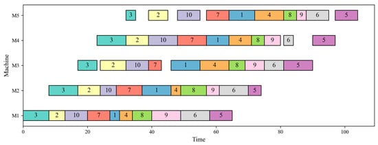 Taking GPFSP with 10 jobs and five machines as an example, the Gantt chart in Figure 2 presents one of the scheduling solutions, with the job sequence being [3, 2, 10, 7, 1, 4, 8, 9, 6, 5].