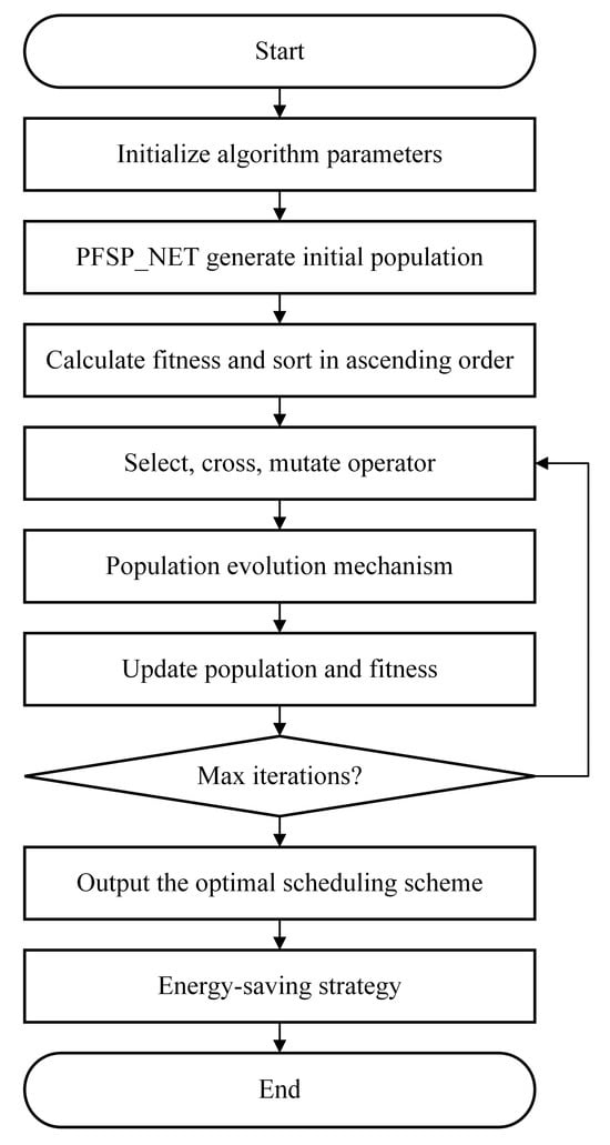 In the following optimization process, the algorithm performs selection, crossover, and mutation operations sequentially, as in a traditional GA. Additionally, an improved population evolution mechanism is introduced to ensure continuous improvement in solution quality. The primary goal of the algorithm is to minimize the makespan, gradually converging to an optimal scheduling solution through iterative optimization.