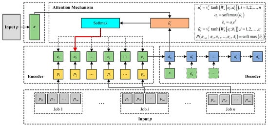 The decoder converts the encoded input information (called the context vector) into an output sequence. It does this step by step, using attention mechanisms to focus on relevant parts of the input while generating each output element, ensuring the final result matches the original input’s meaning and structure. In contrast to the encoder, the decoder incorporates an RNN to summarize the information from previously selected jobs for determining the next job . The RNN is designed to maintain and store historical output states. In this work, the decoder network employs a gated recurrent unit (GRU) RNN model. The performance of this model is on par with that of the LSTM network, yet it achieves a reduction in the number of parameters compared to the LSTM employed in the original pointer network outlined in reference []. In each decoding step , the GRU decoder integrates the hidden state (which contains the knowledge from the previous steps ) with the input encoding representation , and together they compute the conditional probability for selecting the next job. This computation is performed using an attention mechanism, as illustrated in Figure 4.