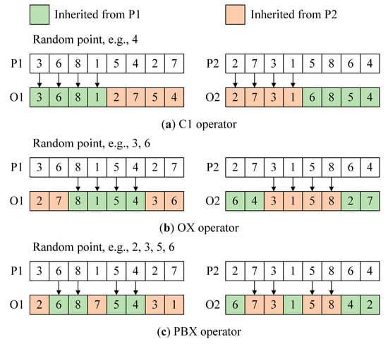 Next, to improve the solutions from PFSP_NET, this paper uses them as the initial population for the IGA. The IGA extends traditional genetic algorithms by adding three crossover operators (C1, OX, PBX) and four mutation operators (swapping, inverse, inserting, and insert inverted block). Hamming distance is also used to prevent premature convergence to local optima. This combination of operators enhances genetic diversity and improves the algorithm’s ability to explore a broad solution space.