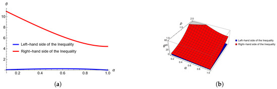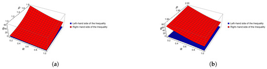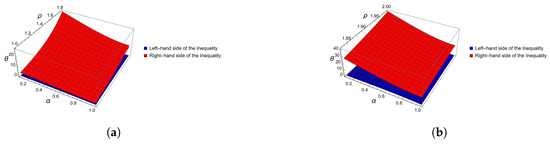 Graphical representation of inequalities of Theorem 3, in Example 1, computed and plotted with Mathematica. (a) Three-dimensional plot for when varies from 0 to 1 and between 1 and . (b) Three-dimensional plot for when varies from 0 to 1 and between and 2.