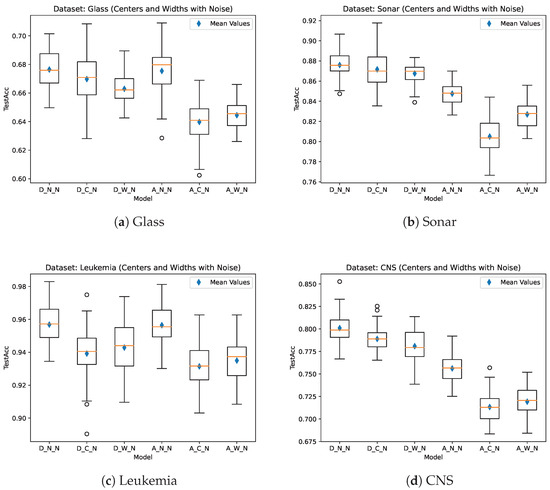 To further illustrate its robustness, we select four representative datasets—Glass, Sonar, Leukemia, and CNS—and present box plots for 50 numerical experimental results, as shown in Figure 2. In each plot, the first three boxes represent the DNFNN without noise, the DNFNN with noise in the center, and the DNFNN with noise in the width. The following three boxes represent the corresponding results for the ANFNN model. The ordinate indicates the test accuracy, with the small blue rhombus and orange line representing the average and median values, respectively. As shown in Figure 2, the test accuracies of both models declined when noise was introduced. However, the DNFNN demonstrated superior resistance to interference compared to the ANFNN.