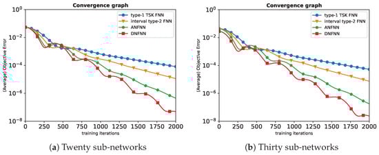 We also performed experiments on regression tasks using the “Concrete Compressive Strength” dataset, which can be accessed via UCI (https://archive.ics.uci.edu/dataset/165/concrete+compressive+strength accessed on 1 December 2024). To evaluate the efficacy of the DNFNN, we compared its convergence performance with several related fuzzy approaches, including the type-1 TSK FNN, interval type-2 FNN, and ANFNN. The results in Figure 3 consistently demonstrate that DNFNN exhibits superior convergence efficiency, achieving both a faster convergence rate and a smaller final objective error.
