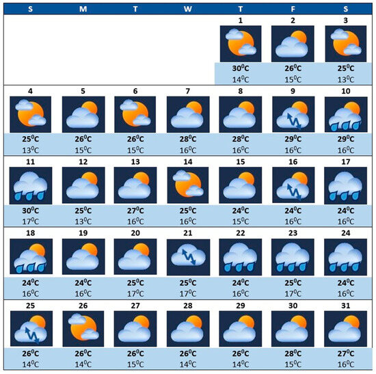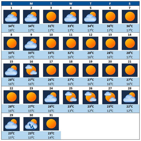 Monthly forecasts are taken for the three summer months of 2021—June, July, and August. Due to the generality of these data, the possibility of a sudden change in weather on one or more of the days under consideration is not taken into account.
