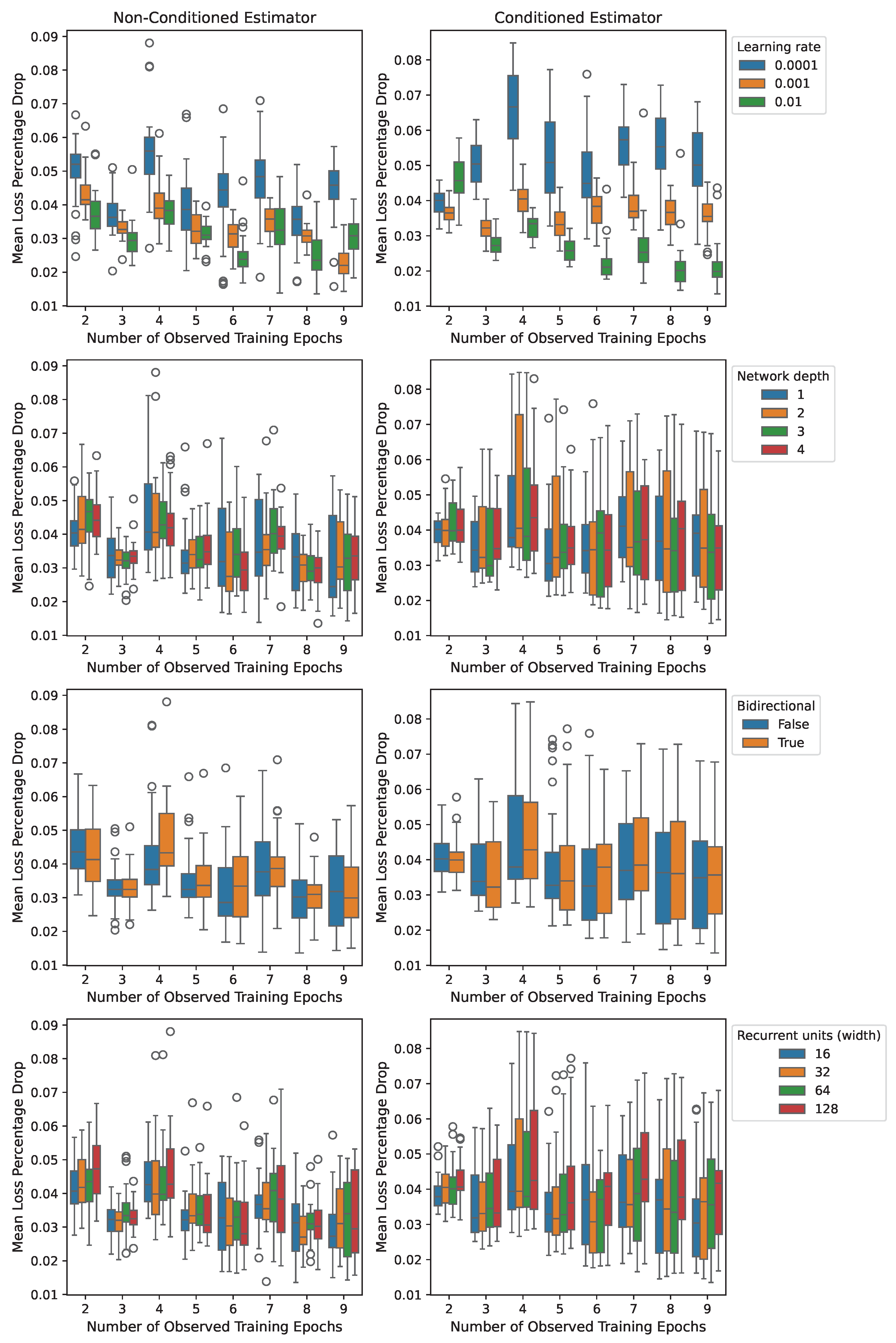 Additionally, other points of improvement have been identified. In this work, the estimator is trained to make estimations with a fixed number N of observed epochs. In some cases, with a few more executions it becomes evident that a model will not perform well. Thus, estimating future performance at each epoch could help detect this and stop further executions.