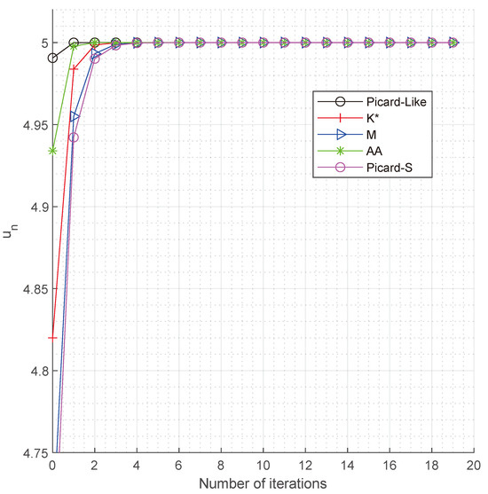 With the best choice of , our new Picard-like-Green iterative scheme performs better than other existing Green’s-function-based iterative schemes such as Picard–Green [7], Mann–Green [8], Ishikawa–Green [9], Khan–Green [29], Picard–Ishikawa–Green [30], and many more in the literature.