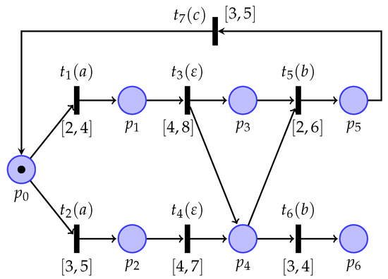 Consider a TLPN G in Figure 1 with seven places and seven transitions, where , , , , , and , with , , , , , , and . Let with and be an RTO. By Definitions 1–3, we have , , , , and .