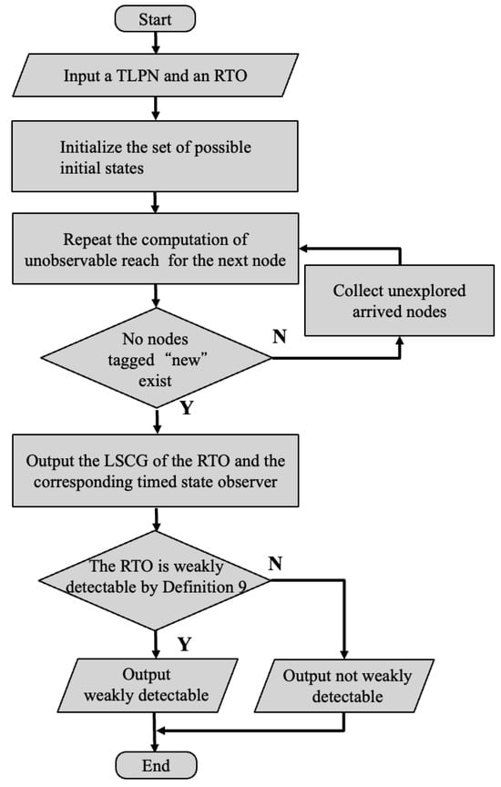 To verify the detectability of a bounded LPN, it is essential to construct an RG and its observer. However, the construction of the observer will unavoidably be affected by the state explosion. In order to address this problem, a timed state observer used to verify state detectability for TLPNs without enumerating all states of a time-dependent system is developed. Specifically, a timed state observer is an observer constructed based on an LSCG that computes the state reached after the occurrence of observable events in order to analyze the detectability of the TLPN systems. Then, the state explosion problem caused by enumerating all states can be addressed. Moreover, to visually represent the proposed algorithm, a concise flowchart for verifying weak detectability is shown in Figure 3.