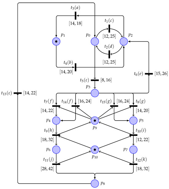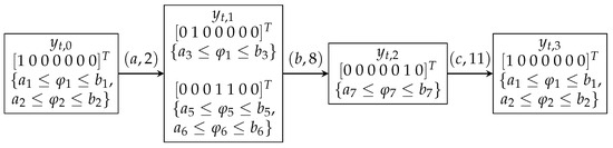 In Line 9, Transition can fire, and a new marking can be obtained. At , for all the transitions enabled at , if is not newly enabled, its lower and upper bounds are and , respectively; otherwise, the lower and upper bounds of equal to their static closed time intervals (Lines 10–14).