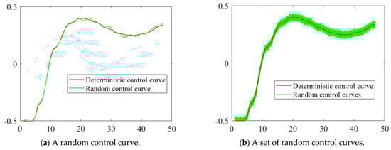 In RBDO, the vector of random design variable can be seen as a multi-dimensional design point, and the uncertainty of is described by assuming that follows the normal distribution , while the random control variables, , in RB-DOP are time-dependent curves whose values vary continuously throughout the time period . This means that the uncertainty of exists at all time nodes . To deal with the uncertainty of the random control variables, , they are discretized on the time axis. Meanwhile, to facilitate the formula description of related concepts, the random control variables at any time node are assumed to follow normal distributions , while other types of random distributions can also be handled in this article. As shown in Figure 1a, the red line is the deterministic control curve and the green line is one of the random control curves generated by assigning uncertainty to the deterministic control curve at the time nodes. The green region in Figure 1b consists of a collection of random control curves, which means that if the ideal control curve is the red line, the real control curve will be any of the curves in the green region.