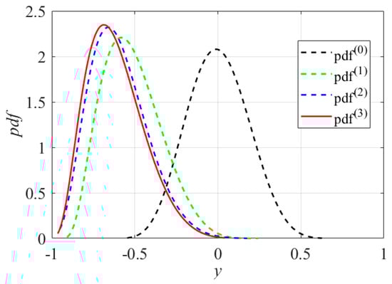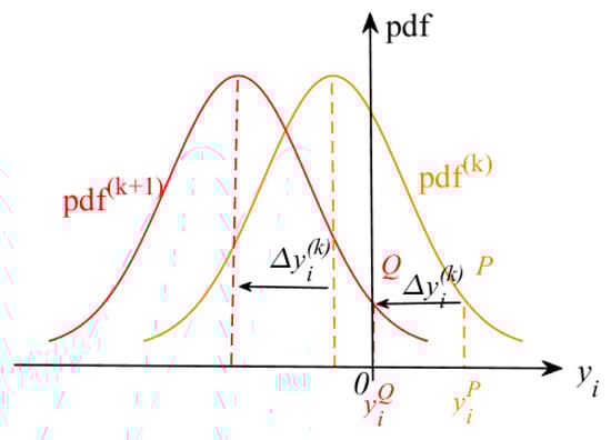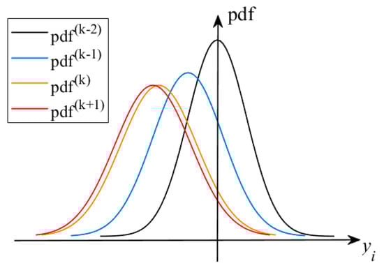 Figure 2 plots the response PDFs at sequential iterations; it can be found that gradually converges and tends to coincide as the solution proceeds, i.e., the mean values and dispersions of in the iterations tend to be the same, especially in the and iterations of the late iteration stage. Note that once the mean value of the constraint function response is given, the search for the optimal mean values of state and control variables is transformed into a DOP problem that has a unique optimal solution because of the limitations imposed by the optimality of the objective function in the DOP problem. That means that the dispersion of can be considered as varying with . Therefore, it is reasonable to assume that only the location of the mean value moves by from in the iteration to in the iteration. Based on this assumption, the PDF in the iteration can be described by the PDF in the iteration, and can be given as