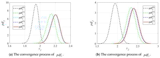 The convergence process of the PDF, , of the inequality function response, , in the probability constraint is illustrated in Figure 5, which shows that moves to in the direction of enhancing reliability in the iterations. Combined with Table 1, it can be found that in , while in . Comparison of and reveals significant variations with respect to the mean values and dispersion degrees, while the locations of the mean values and degrees of dispersion in and show less variation. The convergence process of further validates the reasonability and feasibility of the assumptions in Section 3.3.2 and also demonstrates the accuracy of the optimal RB-DOP solution.