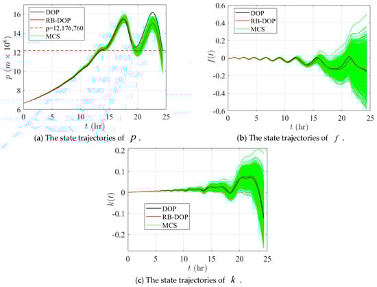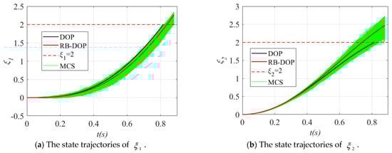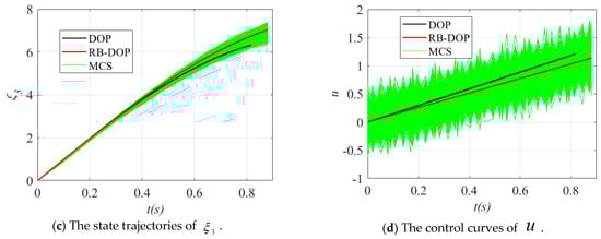 Finally, the state trajectories and control curves in the optimal solutions of DOP and RB-DOP in this example are shown in Figure 6, where the solid black lines indicate the state trajectories or control curves in the optimal DOP solution and the solid red lines represent the state trajectories or control curves in the optimal RB-DOP solution. At the same time, to visualize the effects of the randomness of the control variables on the state trajectories, 1000 control samples were used to create the Monte Carlo simulation (MCS) plots, as shown by the solid green lines. In this example, the control samples follow the normal distribution at all time nodes, where is the optimal control curve in the optimal RB-DOP solution. From the MCS plots in Figure 6, it can be found that although randomness causes small fluctuations in the control variable at each time node (in Figure 6c), these fluctuations have a significant impact on the state trajectories through the state equations as time evolves (in Figure 6a,b). More importantly, almost no trajectories violate the inequality constraint when in Figure 6a, which intuitively proves that the optimal RB-DOP solution obtained by the proposed method satisfies the probability constraint .