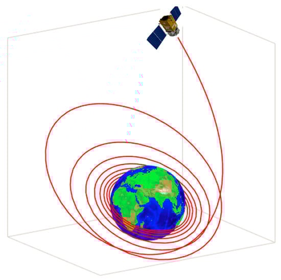 The trajectory optimization of spacecraft transfer from low earth orbit to mission orbit, as shown in Figure 9, is a challenging class of DOP problems, since the dynamics are very nonlinear and the durations of the trajectories are very long [41]. Typically, the goal is to construct the optimal trajectory during the transfer such that the final weight is maximized (i.e., the minimum of fuel is consumed). The DOP of the low-thrust orbit transfer can be represented as