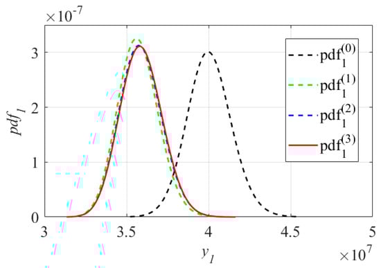In the meantime, the convergence process of the PDF of is illustrated in Figure 10. It can be observed from Figure 10 that moved to in the direction of enhancing reliability in the three iterations; the improvements from to in terms of the mean values and the dispersion degrees are quite distinct, while the mean value and the dispersion degree of converged from to by fine-tuning in the second and third iterations. The convergence process of further validates the reasonability and feasibility of the assumptions in Section 3.3.2 and also demonstrates the accuracy of the RB-DOP optimal solution.