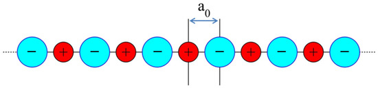 To illustrate applications of the functions defined in Section 1, we begin by considering a one-dimensional ionic crystal, where the ions are arranged alternately as shown in Figure 1. In addition to the Coulomb interaction, we assume the presence of a short-range repulsive force that prevents the lattice from collapsing [16,19]. At equilibrium, the total Coulomb energy acting on a reference ion is exactly balanced by the short-range forces between the ion and its two nearest neighbors. Let us specify these forces in detail.