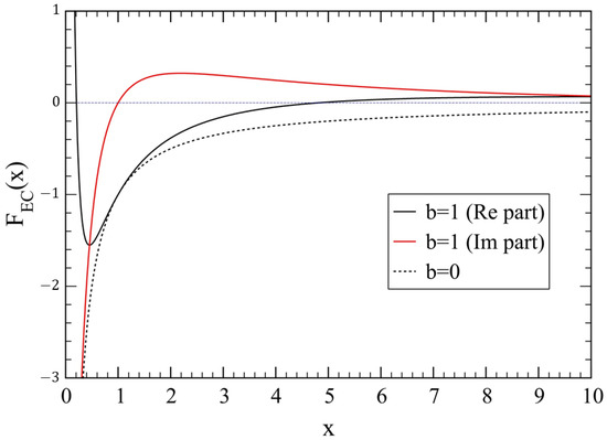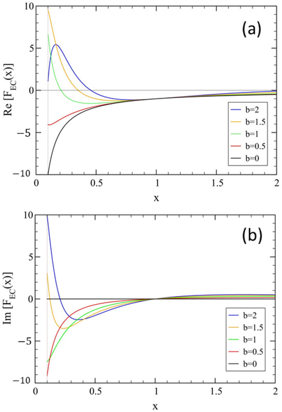 is a complex scaling function. The latter is illustrated in Figure 3 for opposite charges (i.e., corresponding to the negative sign in Equation (15)), and few values of b, for . The lower limit is arbitrary (we use in the plot), and it has been introduced in order to avoid the non-physical oscillations of when .