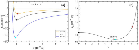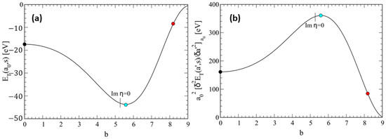 (a) The lattice energy per site, (real part in Equation (19)) vs. , in the cases: . The minimum values are respectively indicated with the (red, black, cyan) circles. Here, we have used , eV, and m, as in Figure 2. (b) The lattice constant, at equilibrium, vs. b, in the case , where the circles correspond to the three values of b considered in (a). To be noted is that the first zeros occur for , the latter given by Equation (7) for , where also , so that the lattice becomes unstable in this case. The location of , for , is indicated in the figure, and in Figure 6 below, with the vertical line.