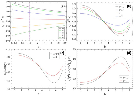 In Figure 5b, we display the lattice constant, , as a function of b, showing that the most stable situation occurs for , where , being about 10% smaller than in the standard case, . For , the energy increases, and so does the lattice constant. This behavior is related to the fact that when , as discussed in Equation (7). Clearly, since the generalized Coulomb term vanishes, the lattice becomes unstable, and no bound state can exist.