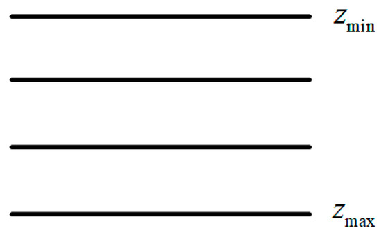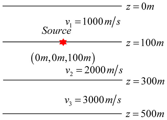 To study the propagation of acoustic waves in a uniform layered medium, the medium model is shown in Figure 1. Considering layered media, the velocity of acoustic waves only changes vertically; a 2D Fourier transform in the horizontal direction is applied to Equation (1) and can obtain