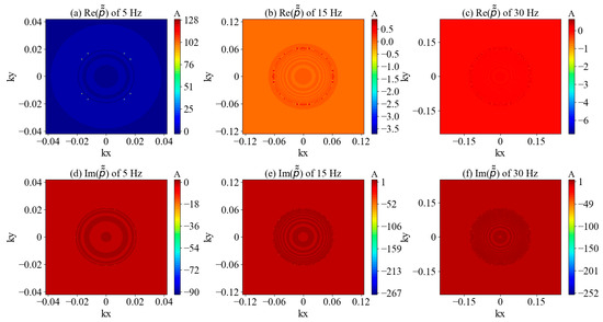 The analytical solution of the wavenumber domain for a point source in full space on the z = 0 m plane. (a–c) represent the real parts of the wavefield spectra at frequencies of 5 Hz, 15 Hz, and 30 Hz, respectively, while (d–f) represent the imaginary parts of the wavefield spectra at frequencies of 5 Hz, 15 Hz, and 30 Hz, respectively.