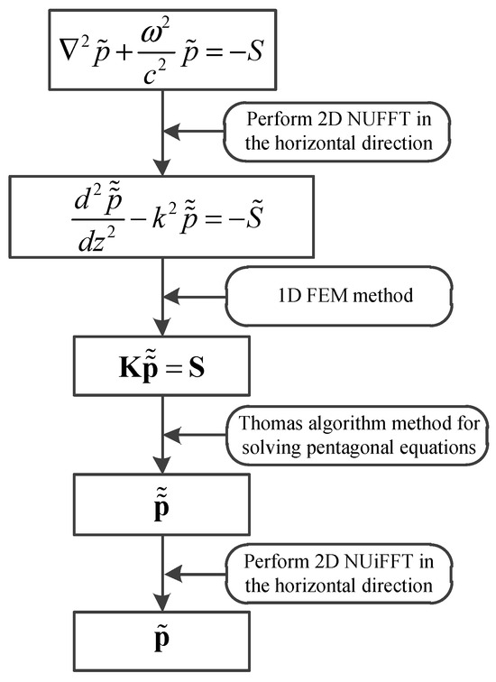 Therefore, based on the NUFFT method, this paper proposes a numerical solution for the 3D frequency-domain point source acoustic equation in the space-wavenumber domain under layered media in the Cartesian coordinate system. Performing a 2D Fourier transform in the horizontal direction on the 3D spatial acoustic equation becomes a one-dimensional space-wavenumber-domain ordinary differential equation, reducing a large 3D problem to a one-dimensional problem and greatly reducing the memory requirements. The one-dimensional ordinary differential equation is horizontally transformed into the wavenumber domain and vertically retained in the spatial domain. The one-dimensional finite-element method is used to obtain the pentagonal equation, and the pursuit method is used to efficiently solve it, obtaining the spatial-wavenumber-domain layered wavefield distribution. Finally, the spatial-domain acoustic wavefield distribution can be obtained through the 2D inverse Fourier transform. This method uses NUFFT in the horizontal direction so that it can perform non-uniform sampling in the horizontal direction. Vertical preservation in the spatial domain can also achieve non-uniform sampling in all three directions, ensuring accuracy while improving algorithm efficiency, thus realizing the efficient and high-precision calculation of 3D point source layered acoustic wavefields.