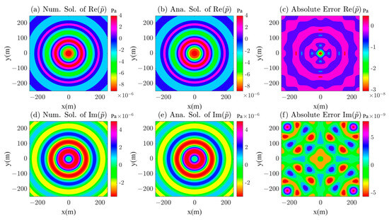 The numerical solution, analytical solution, and absolute error of the point source in the full space of the z = 0 m plane. (a–c) are the numerical solution, analytical solution, and absolute error of the real part of the point source acoustic wavefield, respectively; (d–f) are the numerical solution, analytical solution, and absolute error of the imaginary part of the point source acoustic wavefield, respectively.