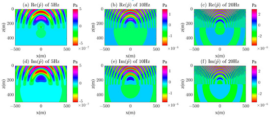 Calculation results of the real and imaginary parts of the wavefield in the half-space of the y = 50 m section; (a) 5 Hz (real part), (b) 10 Hz (real part), (c) 20 Hz (real part), (d) 5 Hz (imaginary part), (e) 10 Hz (imaginary part), (f) 20 Hz (imaginary part).