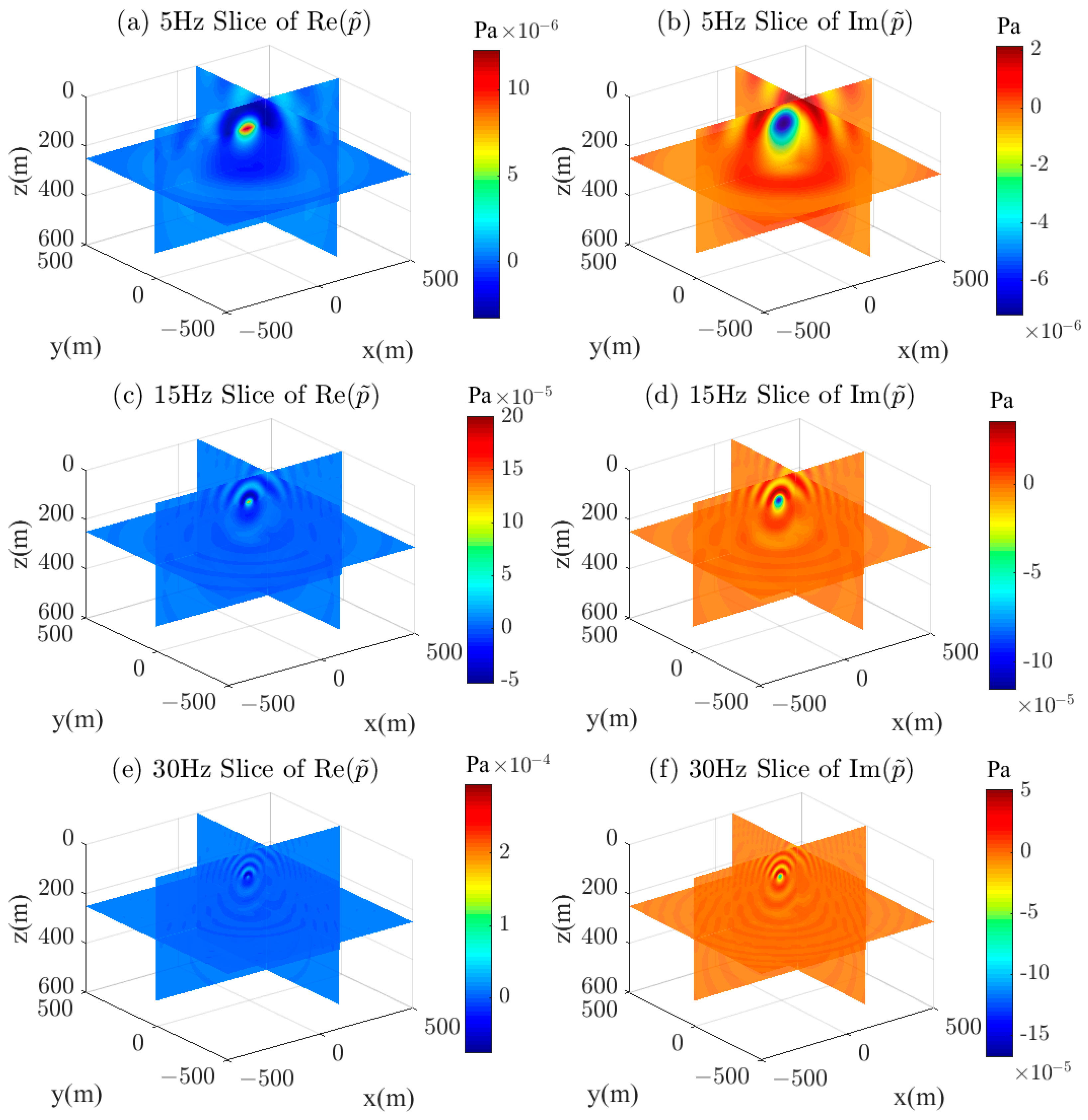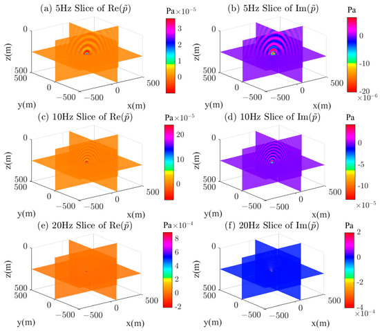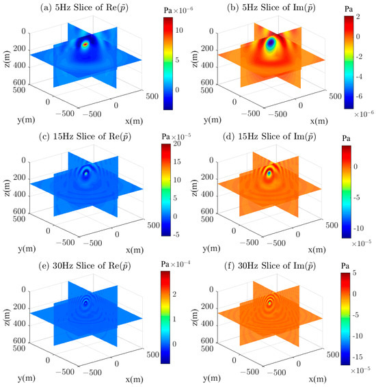 Figure 7 shows the 3D distribution of the real and imaginary parts of the half-space wavefield, visualized at three frequencies of 5 Hz, 10 Hz, and 20 Hz, where (a), (c), and (e) represent the distribution of the real part of the wavefield, and (b), (d), and (f) represent the distribution of the imaginary part of the wavefield. The 3D distribution characteristics of the wavefield at different frequencies can be seen in the figure. As the frequency increases, the wavelength of the acoustic wave becomes smaller, especially in the air layer. This figure indicates that the algorithm proposed in this paper is suitable for the numerical simulation of acoustic wavefields in layered media containing air layers, and has high accuracy.