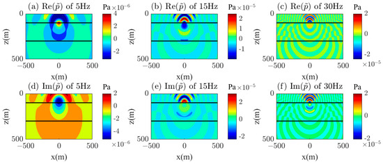 Calculation results of the real and imaginary parts of the wavefield in the half-space of the y = 50 m profile; (a) 5 Hz (real part), (b) 15 Hz (real part), (c) 30 Hz (real part), (d) 5 Hz (imaginary part), (e) 15 Hz (imaginary part), (f) 30 Hz (imaginary part).