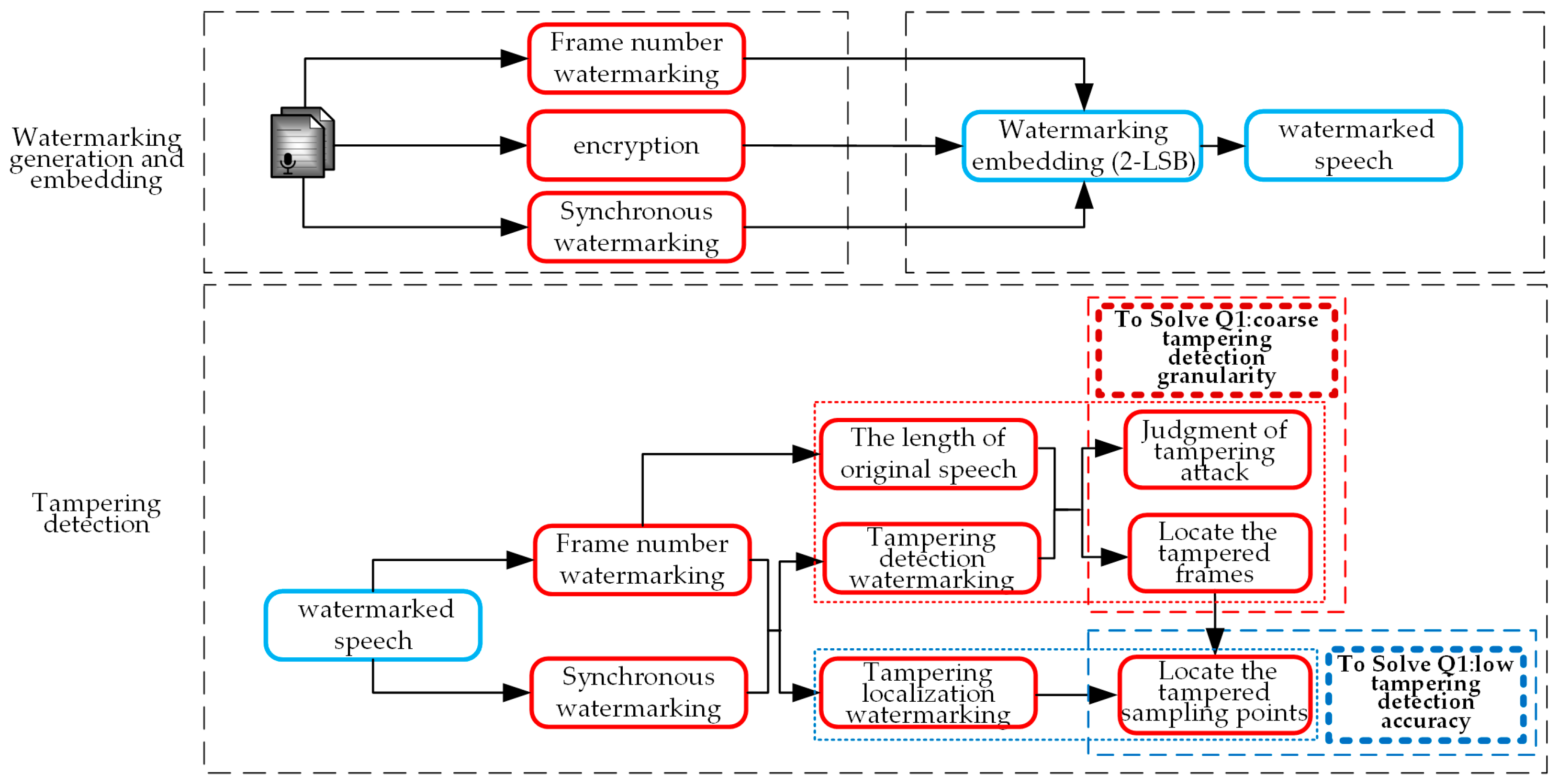 To address these requirements and challenges, this paper proposes an encrypted speech integrity authentication method. For problem (1), this paper proposes a 2-least significant bit (2-LSB)-based dual fragile watermarking method for tampering detection, and the process is shown in