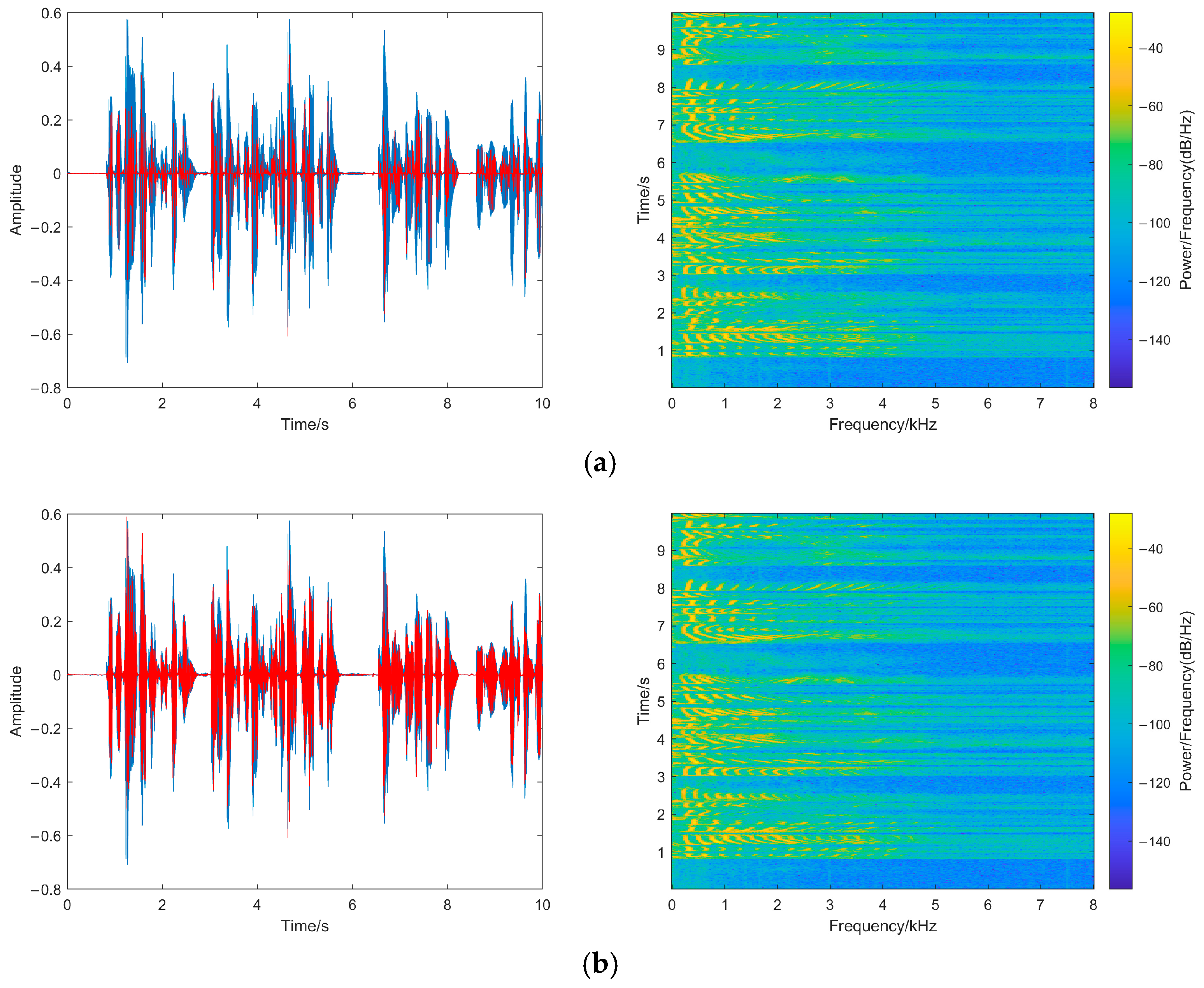 Figure 15, the waveform of the decrypted speech with the correct key is consistent with that of the original speech, and there are no significant differences in the spectrogram compared to the original speech. However, even a slight change in the key has a significant impact on the chaotic sequence, making it impossible to correctly decrypt the encrypted speech and obtain any useful features from the incorrectly decrypted speech.
