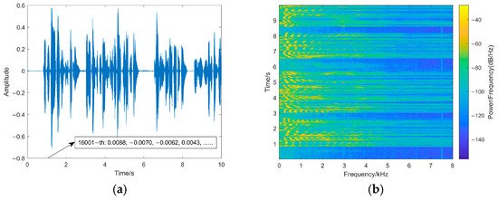 (a) An encrypted speech waveform. (b) An encrypted speech spectrogram. The waveform and spectrogram of encrypted speech.