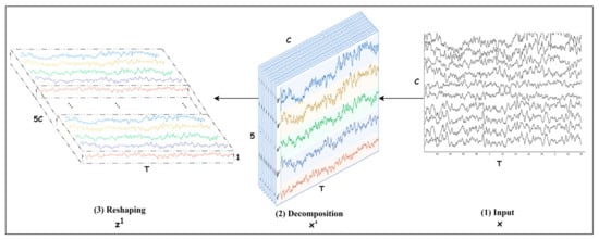 Conducting cognitive tasks triggers multiple brain regions, leading to interaction and information flow between these regions. In addition, the ERS/ERD phenomena in ongoing EEG signals complicate the feature extraction process, because they occur at multiple brain regions, frequencies, and time spans [34]. Focusing on the frequency bands that play crucial roles in MI task detection is essential. For this purpose, each channel of the input EEG trial is decomposed into five frequency bands, producing a multichannel signal , where each channel corresponds to a frequency band. We then apply mapping one to recalibrate to that pays more attention to the salient bands.