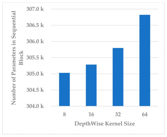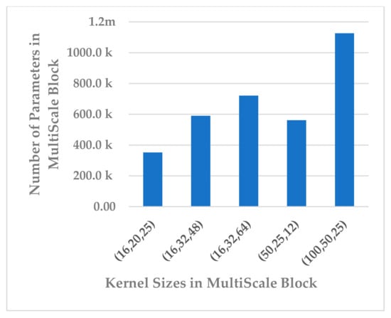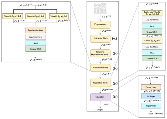 An EEG trial is captured using electrodes as a signal consisting of channels, which record brain activation due to cognitive tasks in various brain lobes [34]. As MI induces changes in the frequency bands related to a subject’s intended movements, this emphasizes that an EEG trial must be decomposed into frequency bands to extract spectral information from each channel, and attention must be paid to each frequency band depending on its relevance to the MI task. For this reason, the attention block () is utilized to elicit and suppress frequency bands depending on their importance to the motor imagery task. Due to the same reason, this is followed by a temporal dependencies block () to work out the long-range dependencies in the channel and time dimensions of the time series data and extract the spatio-temporal features. This is similar to the source separation of independent component analysis (ICA) [35], but it is more robust because it automatically learns the interaction between signals originating from different lobes at different times, taking into account the temporal and channel dimensions. Furthermore, an EEG signal is composed of features at different scales, and it is necessary to extract discriminative representation through a multiscale signal analysis. Multiscale analysis helps to overcome inter- and intra-subject variability [36]. The multiscale block ( performs multiscale analysis in the temporal dimension to extract multiscale features. Finally, the sequential block () learns high-level features relevant to a specific MI task, which are passed to the classification block () for inference. The details of the architecture are presented in Table 2.