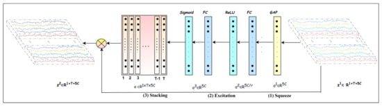 It is composed of the following three operations: squeeze, excitation, and recalibration. Equation (5) computes the recalibration coefficients using squeeze (Equations (7) and (8)), excitation (Equations (9) and (10)), and stacking operations. In the squeeze operation, applies global average pooling across the temporal dimension, as illustrated in Equations (7) and (8). By computing the average along the temporal dimension of , it shrinks to one statistical descriptor. The excitation operation further analyzes the independent descriptors corresponding to 5C bands to learn the interdependencies between bands and generate the recalibration coefficients representing the importance of each of the bands.