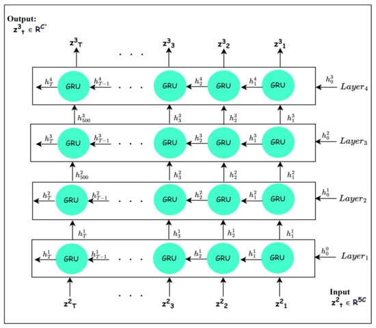 The recalibrated signal is reshaped into to be compatible with the input to GRU block. Each GRU layer in the GRU block processes the input information from the current time and previous times using two gates, as explained in Equations (11)–(14) [40].