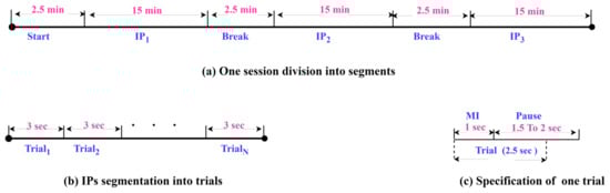 For the experiments, EEG trials of 2.5 s were extracted, as shown in Figure 5c. Each trial involved 1 s for MI task and 1.5 s of the pause period to ensure that the entire motor imagery signal was captured due to the continuity of the thought process after 1 s.