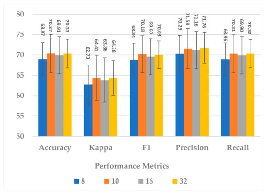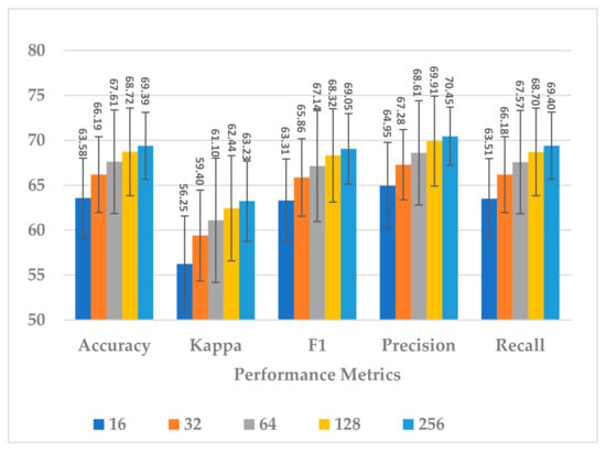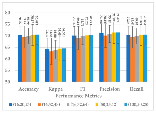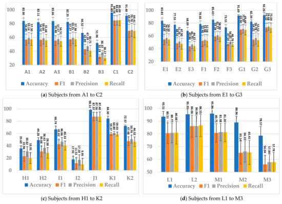 The SSTMNet model achieved an accuracy of 83.76%, 68.70%,70.61%, and 69% in F1 score, precision, and recall by computing the average of the best fold. Furthermore, almost 50% of subjects achieved an accuracy above 90%, and 10 subjects achieved above 80% for the remaining performance metrics. The SSTMNet model was also able to achieve a 100% and 99% accuracy in many subjects, such as C (session 1), J (session 1), L (session 2), and M (session 1). By comparing the average results obtained with the state-of-the-art models presented in Table 6, the SSTMNet model produced a higher accuracy in more than half of the subjects.
