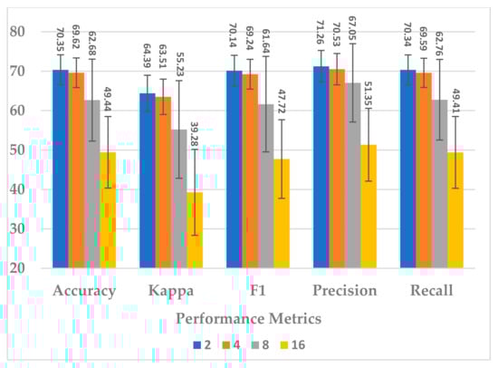 George et al. [13] employed DeepNet and examined different data augmentation methods on the HaLT paradigm [24]. The accuracy ranged between 81.74% and 83.01% compared to no DA 80.73%. George et al. [14] employed Bi-GRU, DeepNet, and Multi-Branch Shallow Net to classify MI tasks in the HaLT paradigm; they used within- and cross-subject transfer learning approaches, in addition to the subject-specific approach for evaluation. The subject-specific evaluation resulted in a better performance (Bi-GRU 77.70 ± 11.06, DeepNet 81.49 ± 11.43, and Multi-Shallow Net 78.32 ± 7.53). George et al. [29] also conducted a study comparing the performances of traditional methods, existing deep learning models, and their combinations in classifying MI tasks in the HaLT paradigm. Deep learning models showed superior results over conventional methods. The highest accuracy achieved among all experiments was 81.92 ± 6.48 using Multi-Shallow Net. Mwata-Velu et al. [30] used EEGNet and introduced two channel selection methods based on channel-wise accuracy and mutual information. They evaluated their methods using the subject-independent protocol with 10-fold cross-validation in the HaLT paradigm; the study reached an accuracy of 83.79%. Yan et al. [31] employed a graph CNN with an attention mechanism, and the EEG signal was reshaped into two graph representations, spatial–temporal and spatial–spectral. The two representations were fed into the model in parallel and then their features were fused. A subject-specific protocol with a 5-fold CV was used to classify the HaLT paradigm, achieving an accuracy of 81.61%.
