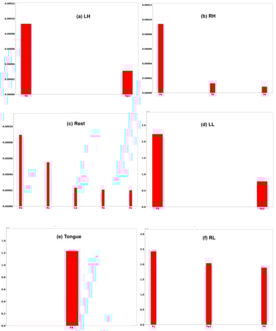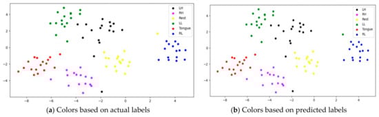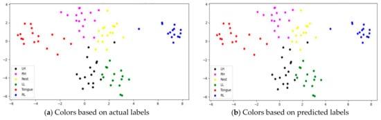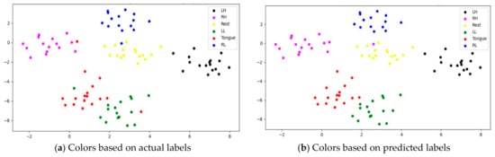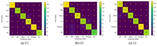 A confusion matrix is an interpretation method that provides insight into a model’s decision making and helps to identify correctly classified and misclassified trials and their relationships. By investigating the confusion matrix and t-SNE plots at the same time, we can determine tasks that are difficult to discriminate due to either similarity in the features extracted by the model or label noise. Figure 23 shows the confusion matrices for six imagery tasks of three subjects, C1, G3, and L2. The presented confusion matrices show consistency with t-SNE feature plots. Only one rest case was misclassified in subjects C1 and L2 with left leg and hand movements, as presented in Figure 23a,c. Furthermore, two cases of tongue movements and one case of right hand and left leg movements were misclassified in subject G3.