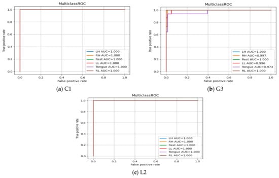 The Receiver Operating Characteristic (ROC) curves are presented in Figure 24 for subjects C1, G3, and L2. It shows the true positive rate (TPR) and false positive rate (FPR) for each MI task at different thresholds values to show the effectiveness of classifier in predicting MI tasks correctly. The area under the curve (AUC) in all three subjects and among six MI tasks produces a high value (above 0.90), which indicates the robustness of the SSTMNet in discriminating each MI task accurately.