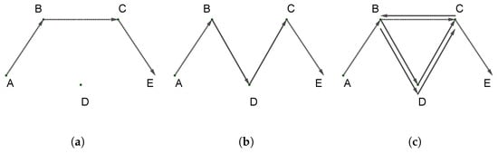 In Figure 1a, the transportation of the  commodity demand is facilitated through the path . However, through the process of optimization, this demand may be rerouted through the path , as depicted in Figure 1b. This is equivalent to adding a directed cycle  to the previous path; see Figure 1c. In fact, improving a feasible solution of the network design problem to an optimal solution can be achieved by simultaneously changing the flows on several directed cycles. Hence, we determine  based on a promising subnetwork consisting of some cycles within the topology structure of the underlying graph. To find a promising subnetwork, we took a two-step approach similar to that in the literature [].
