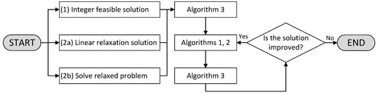 Following the implementation of this technique, the issue of excessive facility installations on each link is effectively resolved. To conclude this section, we draw Figure 3 to demonstrate the flowchart of our proposed algorithm clearly. Precisely, steps (1), (2a), and (2b) in the figure correspond to the three reference solution cases discussed earlier, highlighting their logical connections.