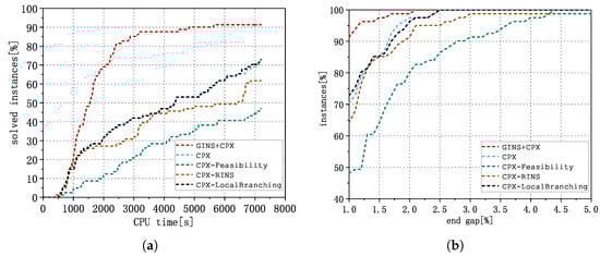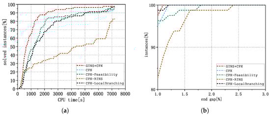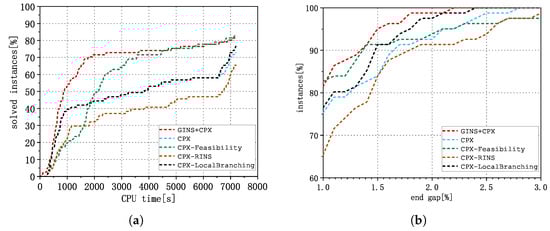 Illustration of the comparison results between GINS + CPX and four CPLEX settings on the directed link models: (a) performance profile graph of solved instances; (b) end gap graph of unsolved instances.
