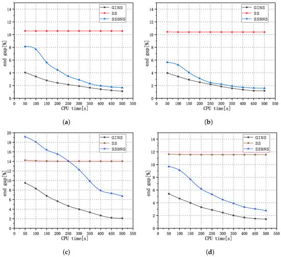 The effectiveness of these heuristics is closely related to the running time. The longer the runtime, the more iterations that can be performed, increasing the likelihood of finding higher-quality feasible solutions. To ensure a fair comparison, we set time limits ranging from 50 to 500 s for all heuristics. This allowed us to evaluate the quality of solutions found within a short time and compare the evolution of the best solution over time. We also used the best solution found by the CPLEX solver within 5 h with default settings to validate the performance of the approximate solutions obtained by different methods. The gap calculation method described in the previous subsection was used. In the following, we use “GINS” to denote the independent GINS algorithm.