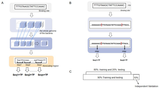 For negative samples, we adopt two methods. The first method introduced in [13] (denoted as RS hereafter) is to randomly select negative samples from the whole genome sequences of the bacteria to which the binding sites belong. Given that the binding regions of bacterial transcription factors are usually located in the promoter regions of genes that are considered non-coding regions [14], we only randomly intercept the non-coding regions from the whole genome sequences of the corresponding bacteria. Difflib (a flexible Python library) is employed for the comparison of sequence similarity between the intercepted sequences and the binding sites, thus avoiding the inadvertent capture of the latter. The sequence is excluded if the similarity score between the two sequences exceeds 90%. Subsequently, 27,236 non-redundant sequences are obtained, and 19% of the data are randomly selected as negative samples, matching the number of positive samples. Approximately 10% of the sequences are randomly selected as the independent dataset, while the remaining 90% are used as the training and test datasets. Figure 1A illustrates the process of RS.