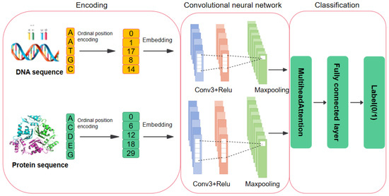 Before embedding, we first carry out ordinal positional encoding on the sequences. It is known from the literature that ordinal positional encoding [10] can improve the accuracy of CNN models and cross-validation, so that each sequence is represented as integers. In order to ensure consistency in sequence length, the maximum length of a DNA sequence is set to 100 and the maximum length of a protein sequence is set to 600. Sequences shorter than the maximum length are padded with zeros to match the fixed length. Then, the embedding layer receives these fixed length vectors and converts them into dense continuous feature vectors with a fixed size. As the first layer of embedding training, the weight matrix is constantly updated during the training process [15], and eventually an embedding matrix is learned to represent the sequence.