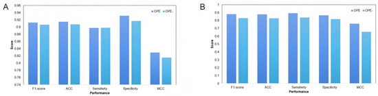 Accuracy can be interpreted as the ratio of correctly predicted samples to all samples, sensitivity as the ratio of all positive samples correctly predicted to all actual positive samples, specificity as the ratio of all negative samples correctly predicted to all actual negative samples, and the F1-score takes into account the precision and recall of a classification model and is defined as the reconciled mean of the model precision and recall. These values range from 0 to 1, and larger values represent better model performance. The Matthews correlation coefficient takes into account the counts of all four categories in the confusion matrix and evaluates them collectively, with a range of [−1, 1]. Where −1 means that the model’s prediction is completely opposite to the real situation, 0 means that the model’s performance is equivalent to random prediction, and 1 means perfect prediction. The Matthews correlation coefficient is particularly suitable for binary classification problems with unbalanced samples, as it takes into account the prediction performance of each category simultaneously. In order to measure the performance of the models, we calculate the accuracy (), sensitivity, specificity, F1-score, and Matthews correlation coefficient (), which are defined below [17]: